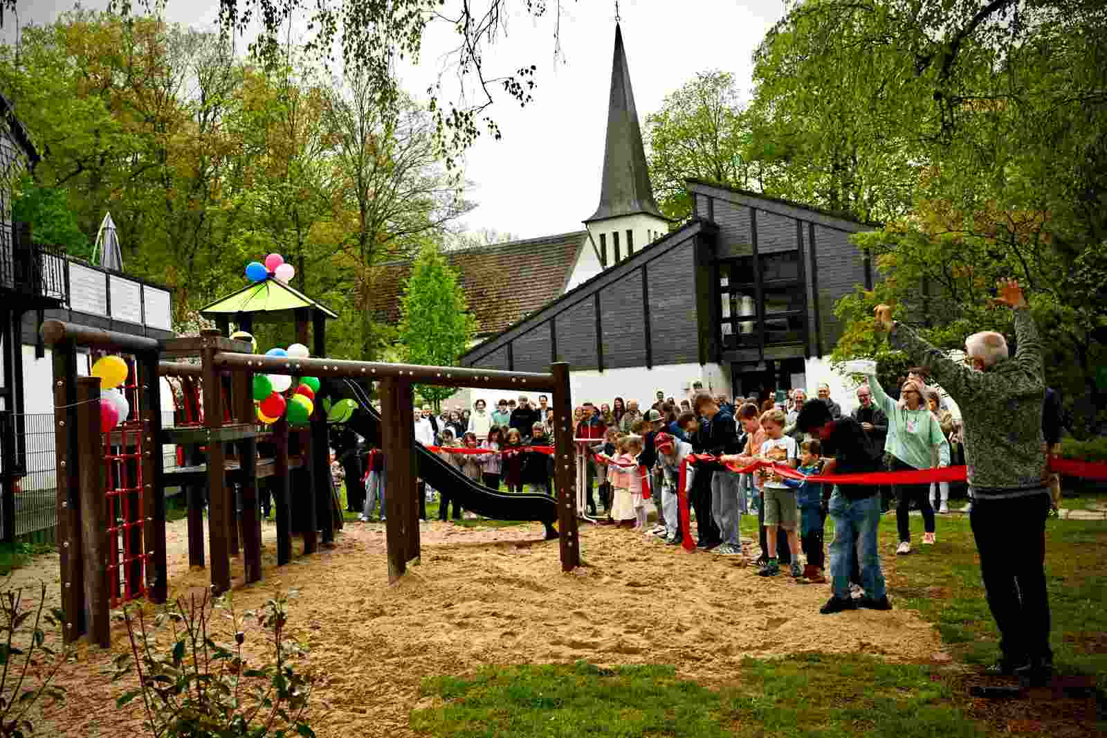 Worauf die Kinder mit Spannung gewartet haben: der neue Spielplatz hinter dem Gemeindezentrum Opladenerstraße mit Klettergerüst, Rutsche und Nestschaukel ist fertig gestellt und wurde am 19. April mit Pizza und fröhlichem Beisammensein von jung und alt nach dem Gottesdienst eingeweiht. Nun freuen sich die Kinder vom sonntäglichen Kindergottesdienst und auch vom KIWI Action Samstag auf viel Spaß auf den neuen Geräten. Mitglieder und Freunde des Fördervereins hatten mit einer Spende von rund 30.000€ den neuen Spielplatz ermöglicht.